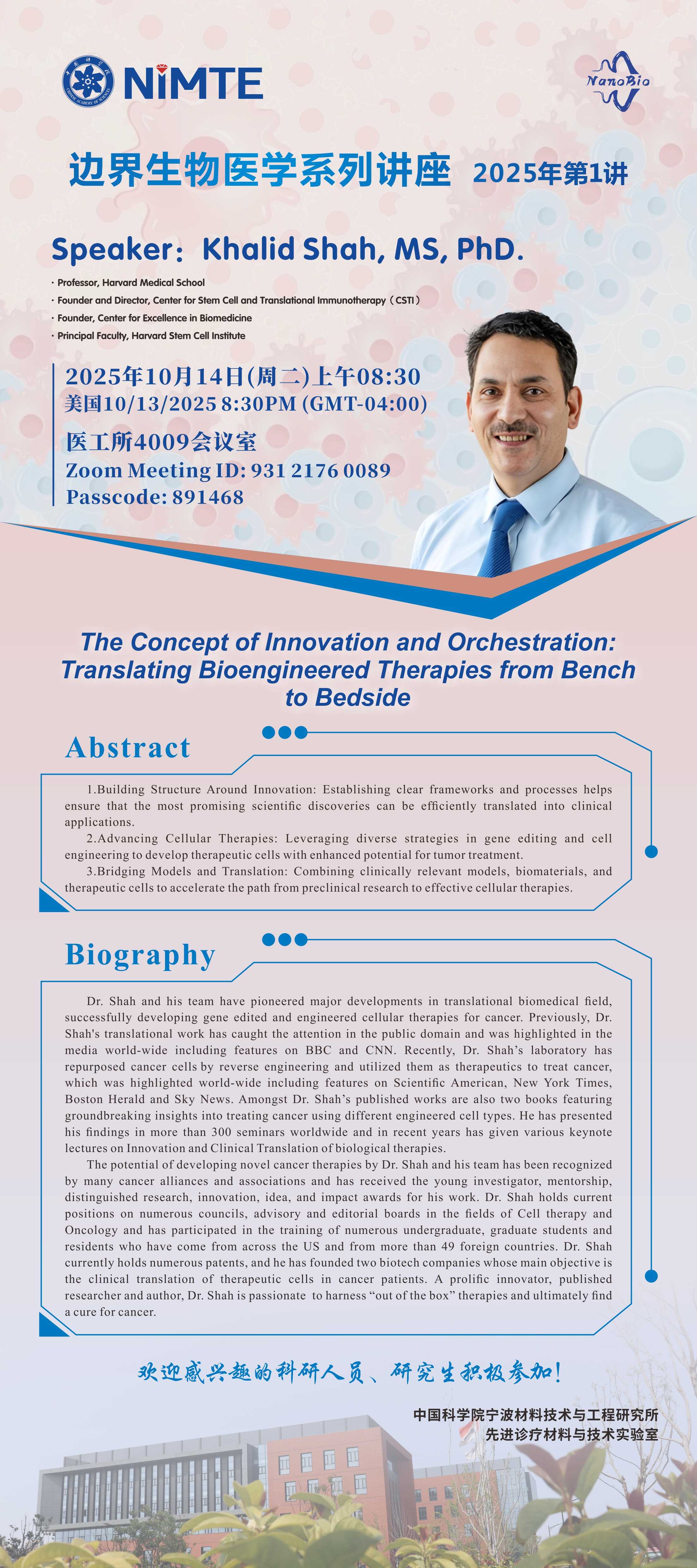 10月14日:Khalid Shah:The Concept of Innovation and Orchestration:Translating Bioengineered Therapies from Bench to Bedside 发布:2025-10-13 点赞: 字号:小 大 打印: