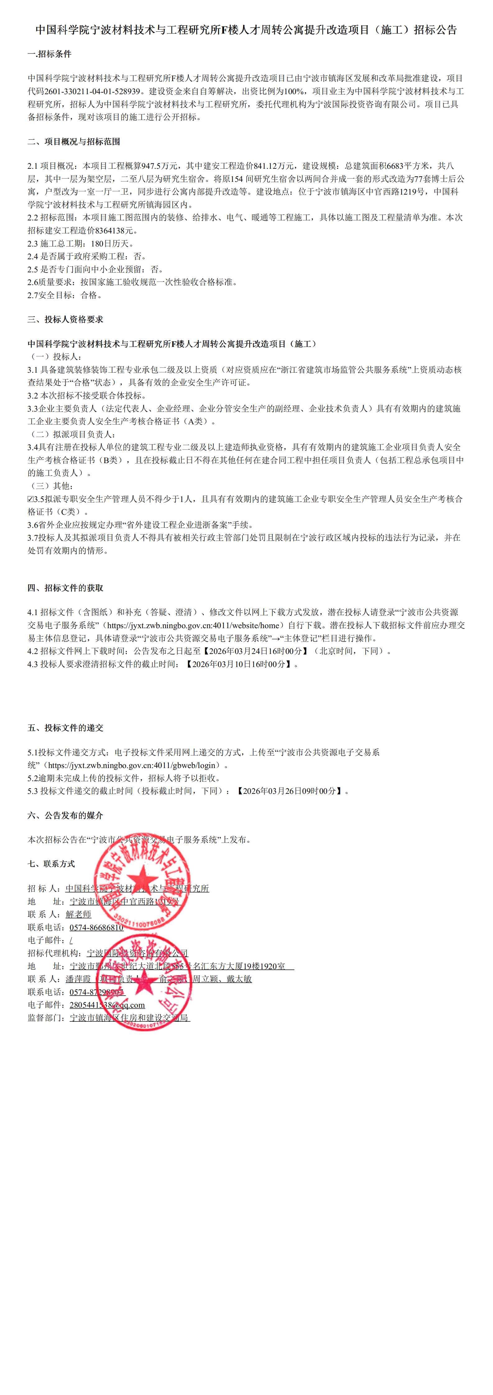 中国科学院宁波材料技术与工程研究所F楼人才周转公寓提升改造项目(施工)项目招标公告