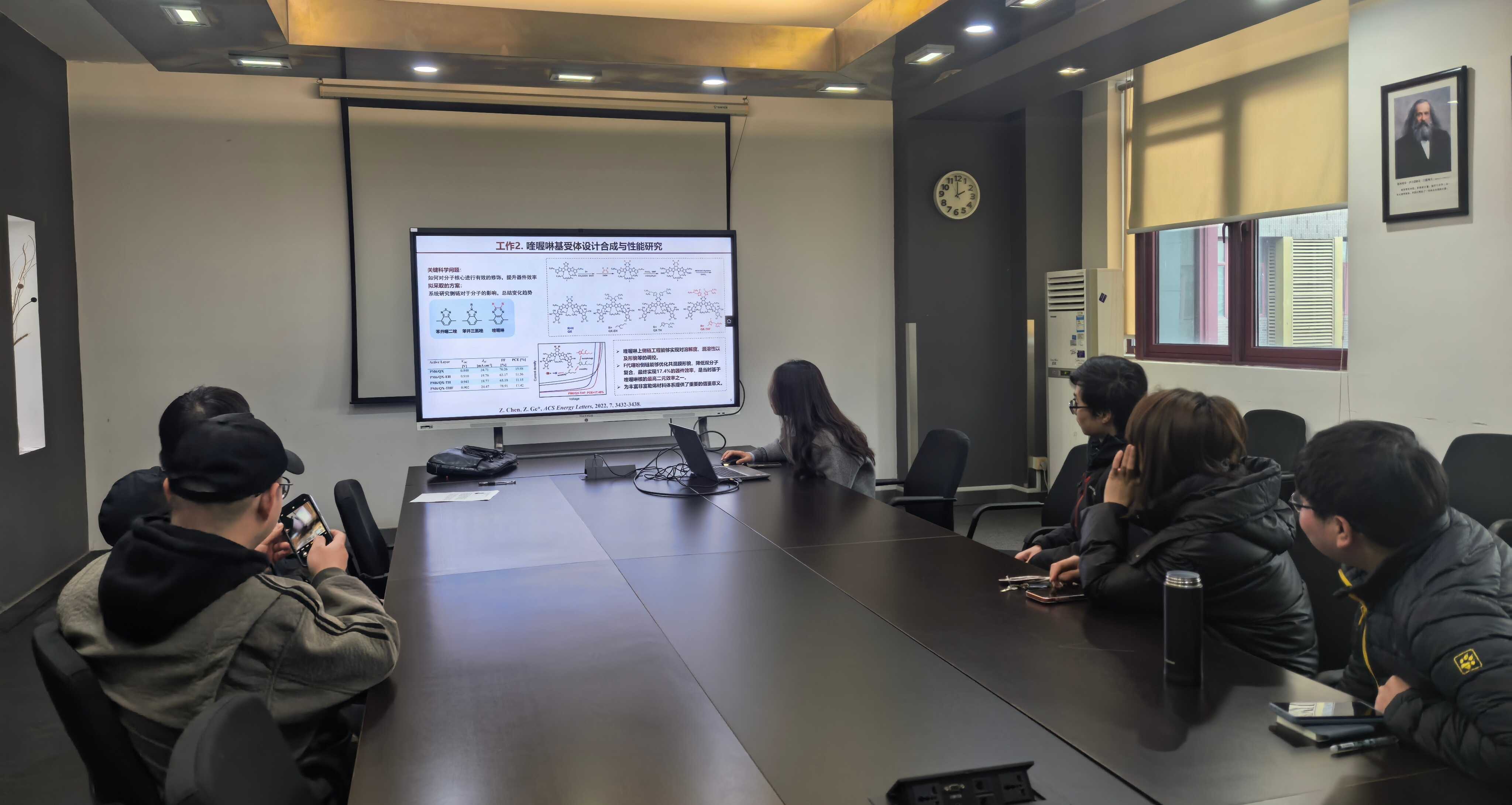 报告围绕有机太阳能电池领域的研究进展与关键科学问题展开,系统介绍了非富勒烯受体材料及多组分体系在有机太阳能电池中的研究思路与发展趋势。陈振宇结合自身研究工作,重点分享了其在非富勒烯受体与客体分子设计、多组分(三元)体系构筑、结晶行为与薄膜形貌调控以及高效率器件构建等方面的研究进展,阐述了通过分子结构设计与器件物理调控实现器件性能优化的有效路径。在交流环节,陈振宇与现场科研人员和研究生就多组分体系的材料选择、成膜动力学调控及器件稳定性提升等问题进行了深入讨论,进一步加深了与会人员对多组分有机太阳能电池体系的理解。