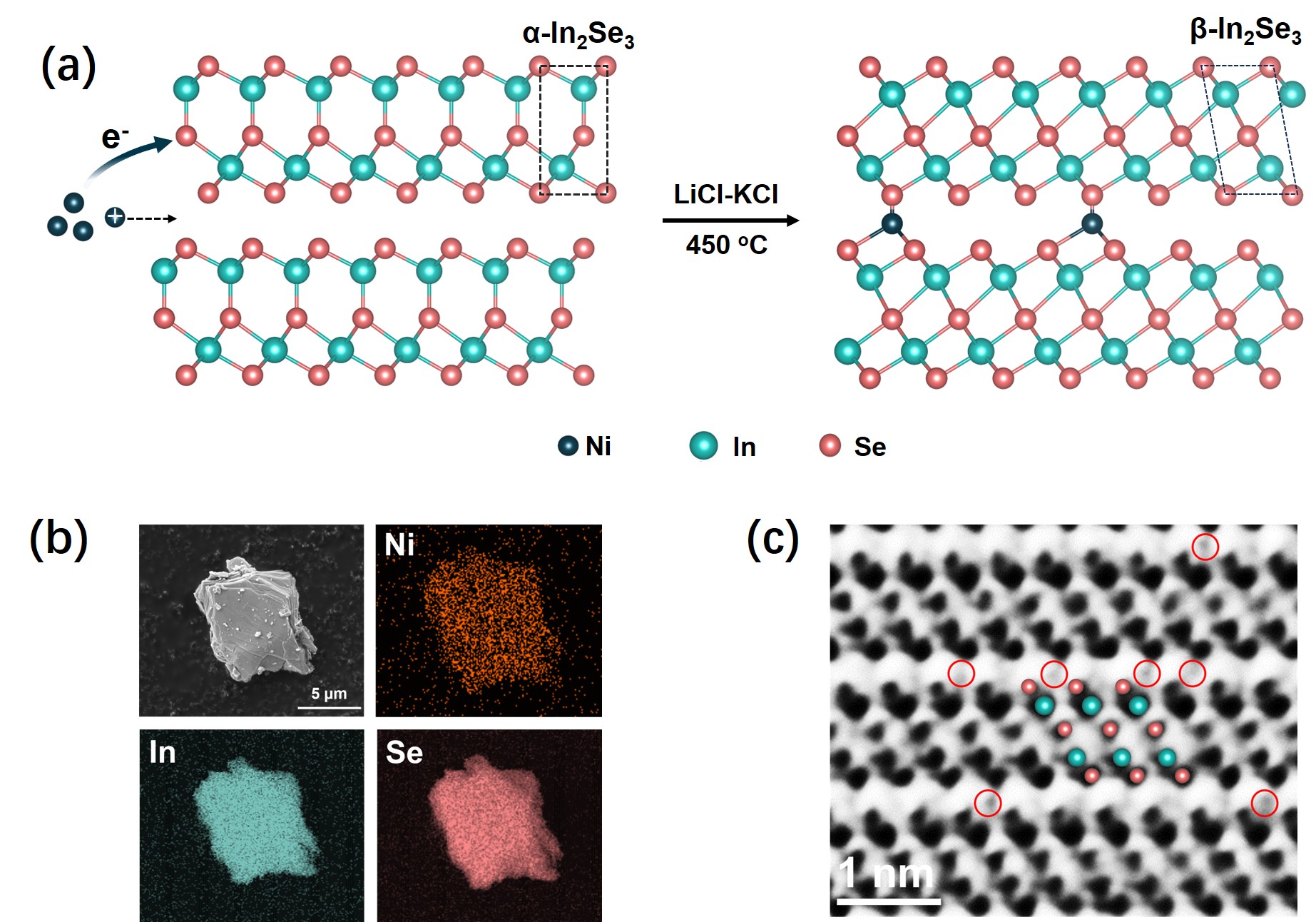 图1 (a)Ni原子插层In2Se3过程示意图;(b)扫描电镜和能谱分析显示Ni插层In2Se3样品的形貌和元素分布;(c)高分辨球差电镜显示Ni0.3In2Se3的原子结构,其中Ni原子在In2Se3层间随机分布