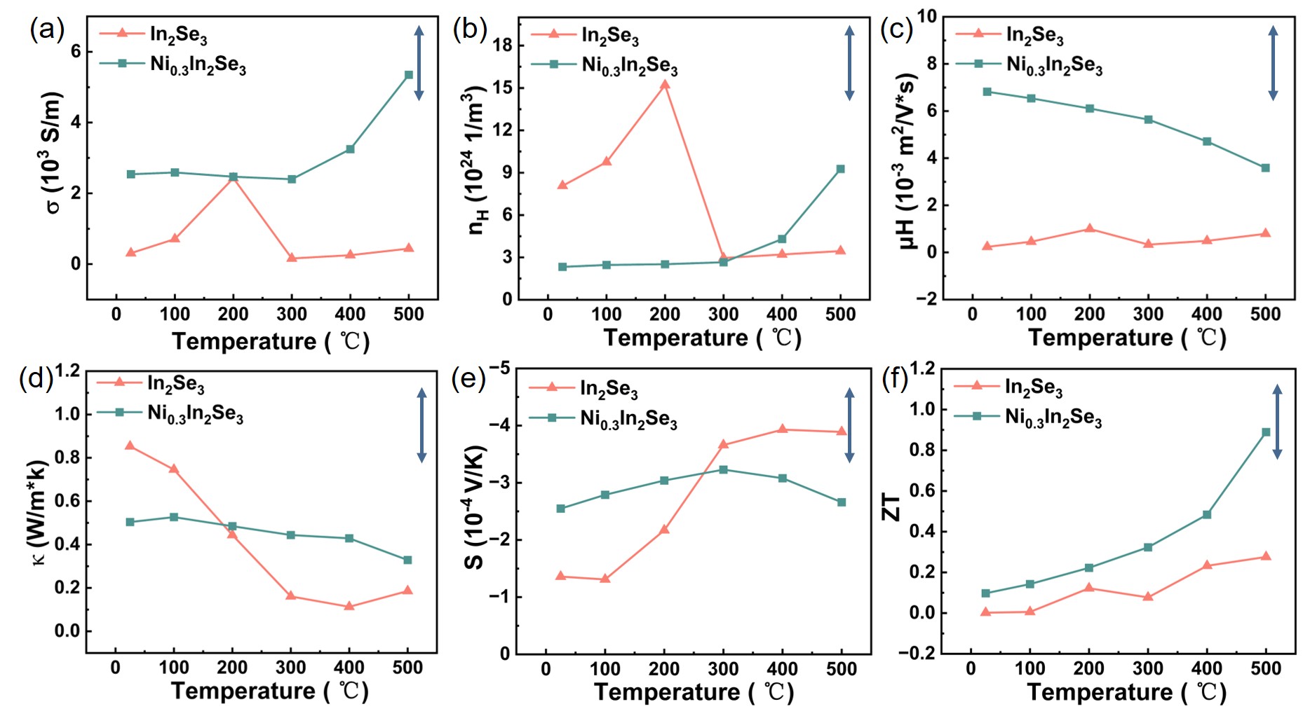 图3 In2Se3和Ni0.3In2Se3在室温至500℃温度范围内沿面外方向的物性对比:(a)电导率;(b)载流子浓度;(c)载流子迁移率;(d)热导率;(e)塞贝克系数;(f)热电ZT值