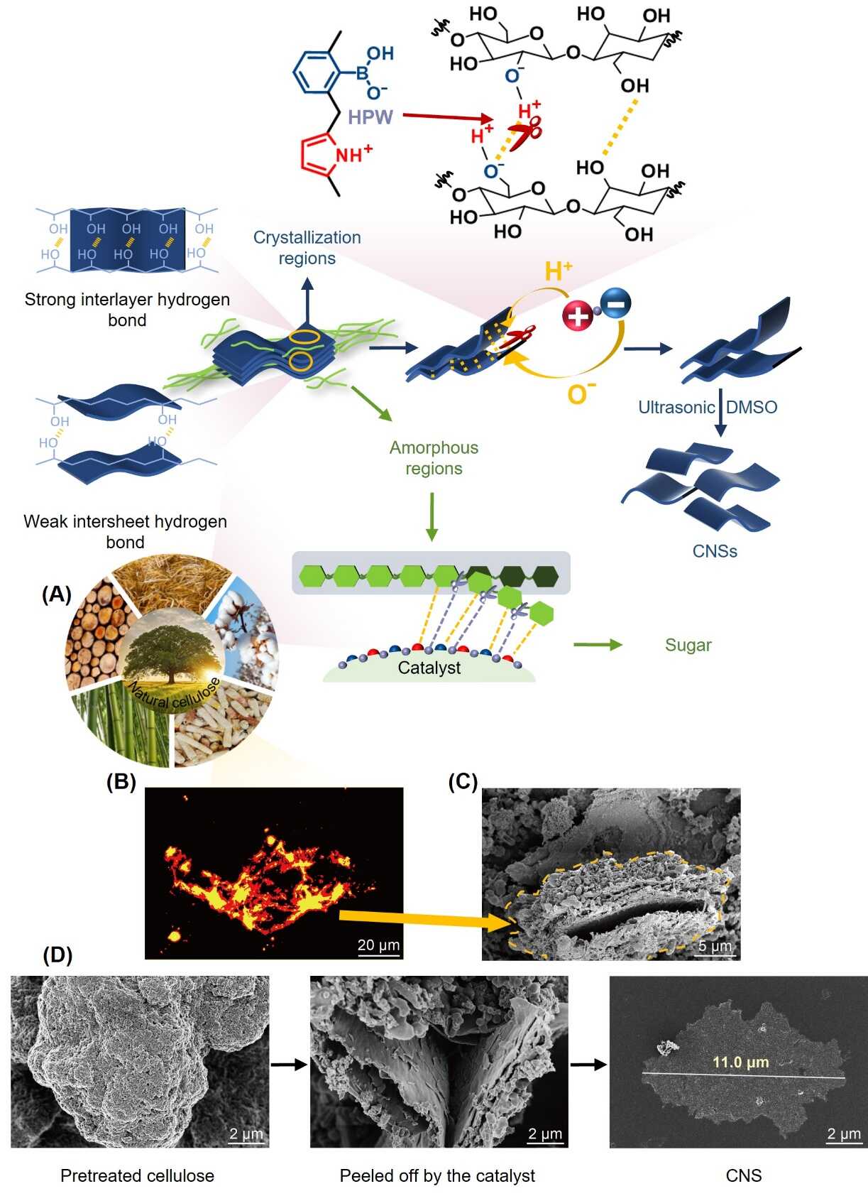 (C)原始纤维素纳米片的扫描电镜(SEM)照片,(D)预处理后纤维素在水解过程中的形貌变化