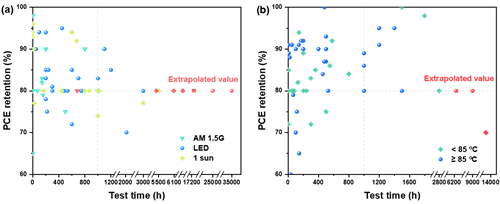 图2 光稳定性(a)和热稳定性(b)的PCE保留率与测试时间的统计图