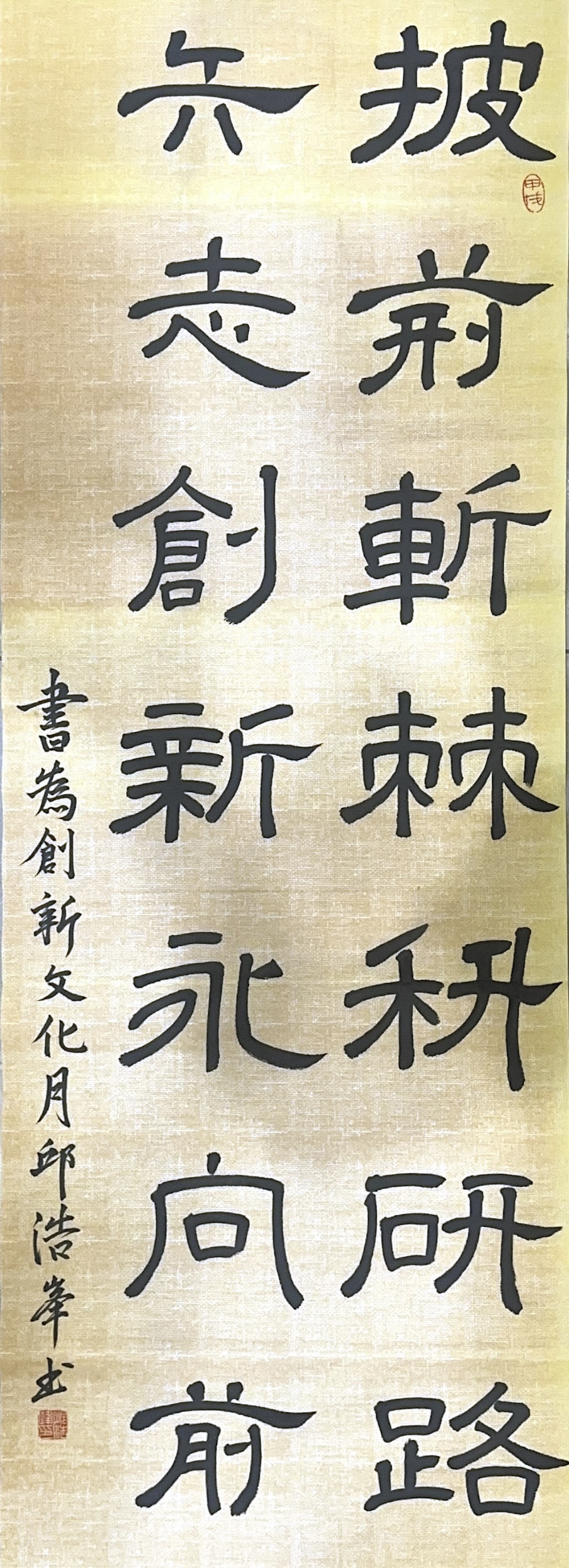 作品简介:本作品以隶书书写"披荆斩棘科研路 矢志创新永向前",展现科研工作者勇攀科技高峰的坚韧精神。笔法取法汉隶,蚕头燕尾间见沉稳力道,象征科研攻关的扎实步履,结体方正古朴,呼应科学家求真务实的品格。作品凝练"永不言弃"的信念,激励后来者在抢占科技制高点的征程上,无畏险阻、奋勇争先。