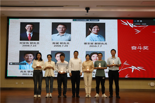 为感谢坚守岗位十年余,始终坚守初心、兢兢业业的员工们,大会表彰了刘宜伟、陈斌、谢亚丽、尚杰、巫远招、孙丹丹、吴振广、胡超、周酉林、李金财、秦琴。刘宜伟、谢亚丽作为党员代表发言,他们讲述了入所初期,从怀着忐忑的心情憧憬未来转变为坚定地迈向未来,他们感谢了一起奋斗、一起成长的老师同学们,并以此鼓励在读的学生们珍惜现有平台和实验条件,扎实推进科研工作,勇于创新。