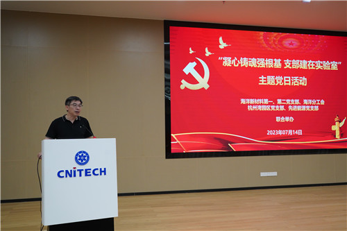 为了深入开展学习贯彻习近平新时代中国特色社会主义思想主题教育,厚植家国情怀,激发使命担当,凝聚奋进力量,推进海洋实验室科技创新中心工作,7月14日,中国科学院宁波材料技术与工程研究所海洋新材料第一、第二党支部联合海洋分工会开展“凝心铸魂强根基 支部建在实验室”主题党日活动。本次活动由海洋新材料第一党支部副书记陈海明和海洋新材料第二党支部书记杨丽景主持,支部全体党员参会,副所长(主持工作)王立平、纪委书记杨振华、党政办主任金乐应邀参会。