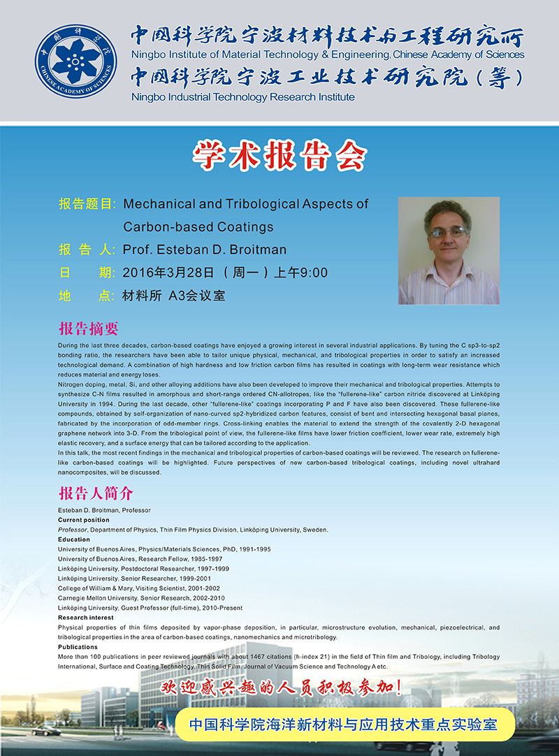 3月28日:Esteban D. Broitman:Mechanical and Tribological Aspects of Carbon-based Coatings 发布:2016-03-22 点赞: 字号:小 大 打印: