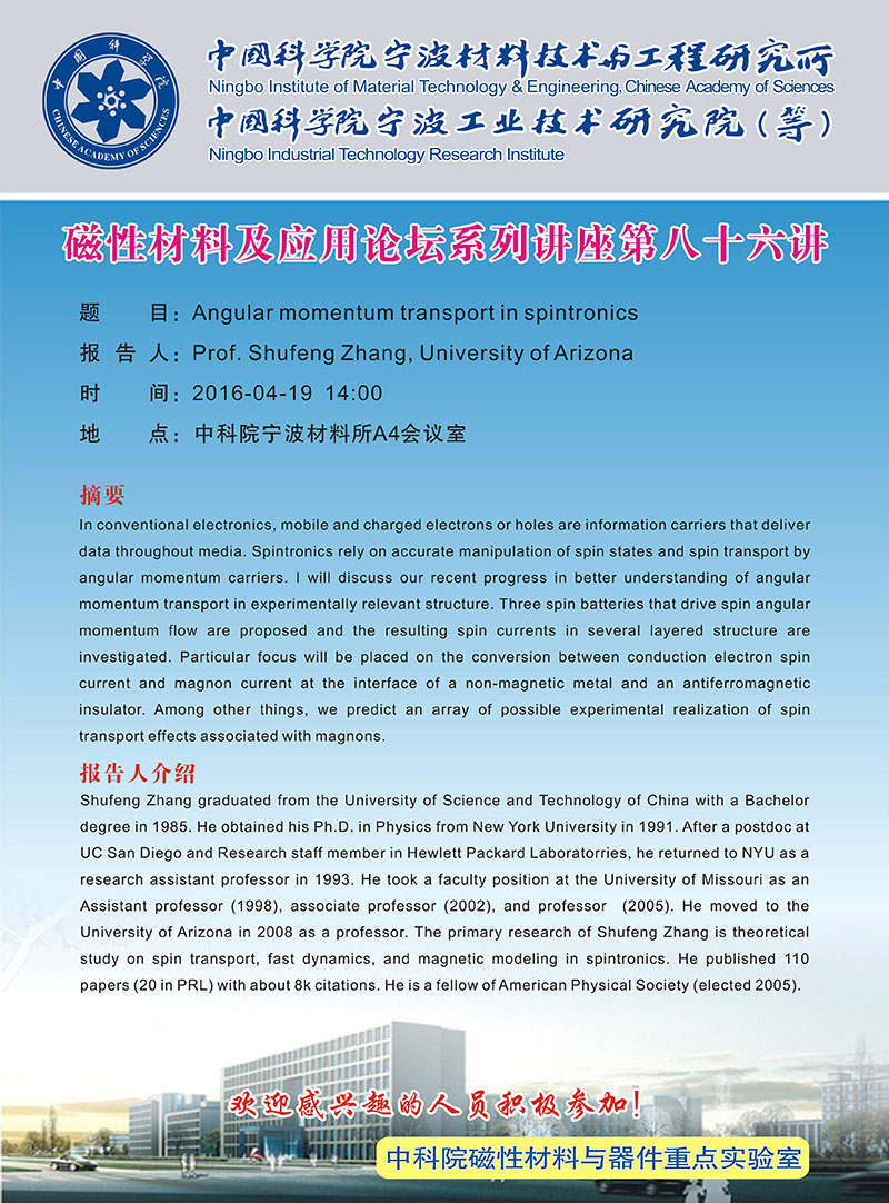 4月19日:Prof. Shufeng Zhang:Angular momentum transport in spintronics