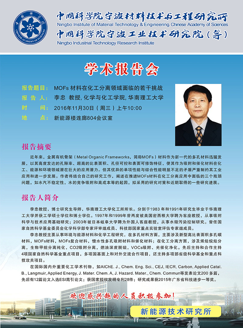 11月30日:李忠:MOFs材料在化工分离领域面临的若干挑战