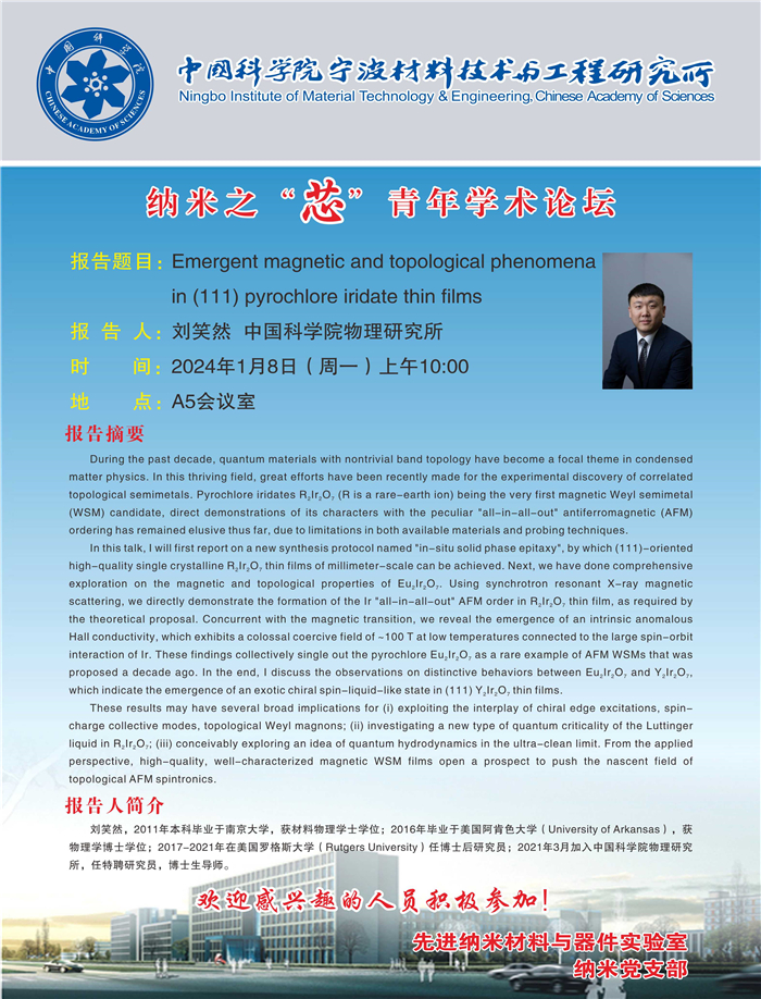 1月8日:刘笑然:Emergent magnetic and topological phenomenain (111) pyrochlore iridate thin films