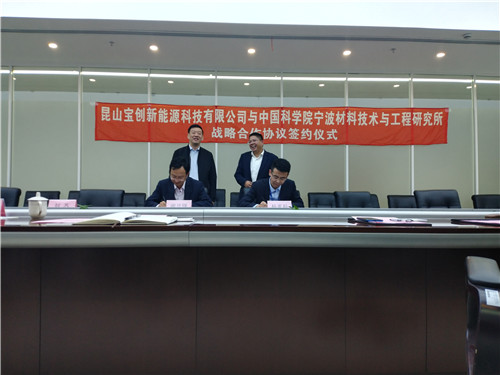 11月11日下午,中国科学院宁波材料技术与工程研究所动力锂电池工程实验室和宝能集团旗下宝创新能源科技有限公司在昆山签署战略合作协议,宝创新能源总裁助理杨重科与宁波材料所技术转移处处长谢开锋代表双方签字,鸿鹏新能源CEO孙伟、宁波材料所刘兆平研究员等双方领导及相关科研人员参加了签约仪式。