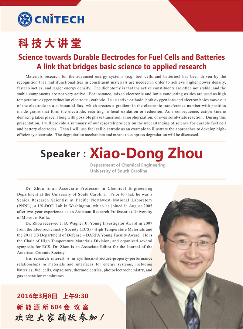 科技大讲堂:Xiao-Dong Zhou:Science towards Durable Electrodes for Fuel Cells and Batteries A link that bridges basic science to applied research 发布:2016-02-29 点赞: 字号:小 大 打印: