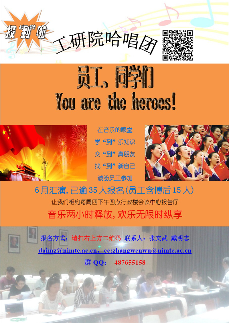 报名方式:请有意向的员工及学生,在4月21日前将您的姓名及联系方式,发送至合唱团副团长戴明志处:daimz@nimte.ac.cn