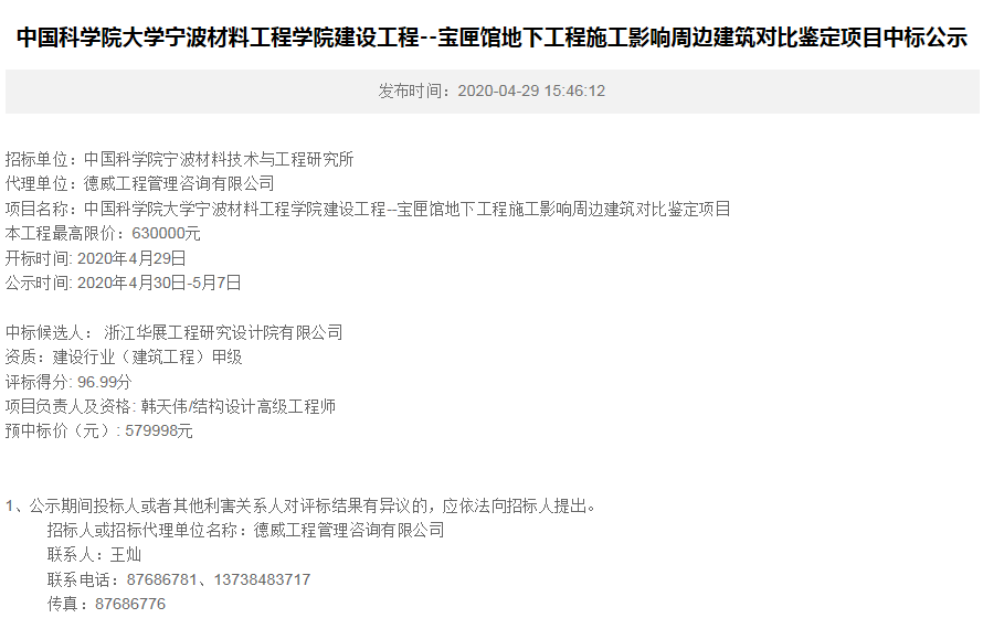 中国科学院大学宁波材料工程学院建设工程——宝匣馆地下工程施工影响周边建筑对比鉴定项目中标公示 发布:2020-04-29 点赞: 字号:小 大 打印: 公示链接:http://www.deweizj.com/News/newShow/id/625.html