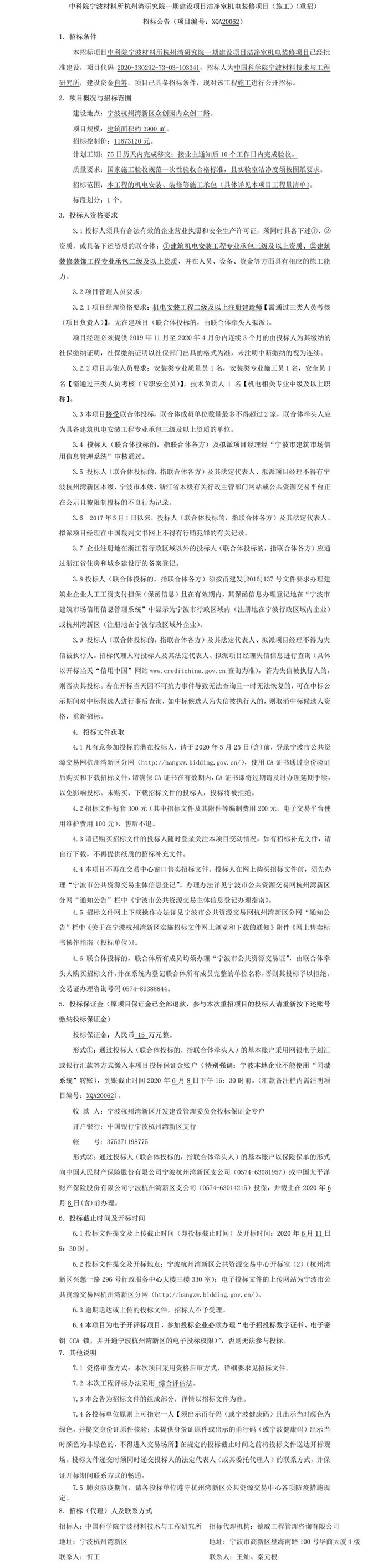 (编号:XQA20062)中科院宁波材料所杭州湾研究院一期建设项目洁净室机电装修项目(施工)(重招)招标公告 发布:2020-05-18 点赞: 字号:小 大 打印: 公告链接:http://hangzw.bidding.gov.cn/gcjszbgg/578225.jhtml
