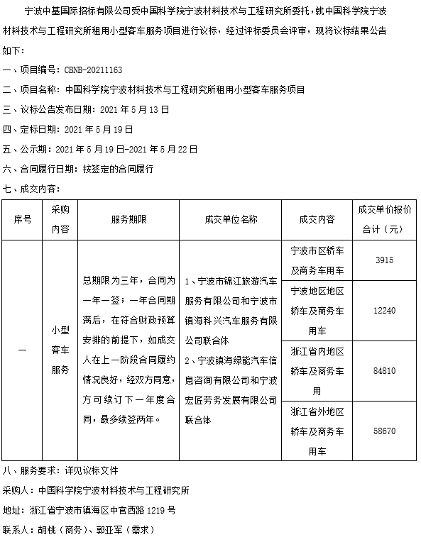 中国科学院宁波材料技术与工程研究所租用小型客车服务项目的采购结果公告 发布:2021-05-26 点赞: 字号:小 大 打印: 公示链接:http://www.nbzfcg.cn/project/Notice_view.aspx?Id=99475