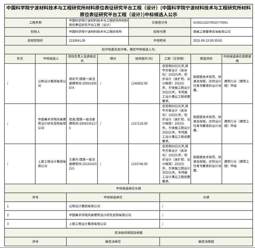 中国科学院宁波材料技术与工程研究所材料原位表征研究平台工程(设计)中标候选人公示 发布:2025-09-24 点赞: 字号:小 大 打印: 公示网址:https://jyxt.zwb.ningbo.gov.cn:4011/website/article?article_ID=9354723&code=020105&project_ID=ff80808198cc0ea60198dfbdfeab4637&isShowTypeSteps=true&project_NO=A3302110270025775001&sidebarID=0201&id=%239354723