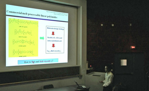 方省众做了“Synthesis and Characterization of Isomeric Poly(Thioether Ether Imide)s with Good Processability and Hydrolytic stability”的报告。报告指出硫醚异构聚酰亚胺结构与性能之间的关系,特别是在耐热性、熔体加工性等方面的优势,引起了众多与会人员的强烈关注。另外方省众研究员和陈国飞助理研究员还参展了“Effect of sulfone group on thermal properties of poly(ether sulfone imide)s”和“Preparation and characterization of novel sulfonatedcopolyimides for proton exchange membranes based on4,4’-sulfide-bis(naphthalic anhydride)”的两个Poster,介绍了硫醚聚酰亚胺的热稳定性以及质子交换膜方面的工作。