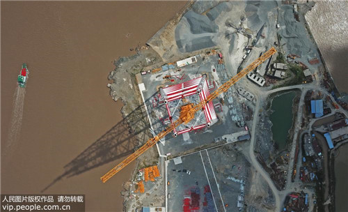 据介绍,浙江舟山500千伏联网输变电工程连接舟山本岛和宁波镇海及北仑,于2016年12月开工建设,其中在金塘岛、册子岛上各建设一座380米高的输电高塔,工程完成后输电容量达200万千瓦,将为宁波舟山港和浙江自贸区输送能源。章勇涛/人民图片