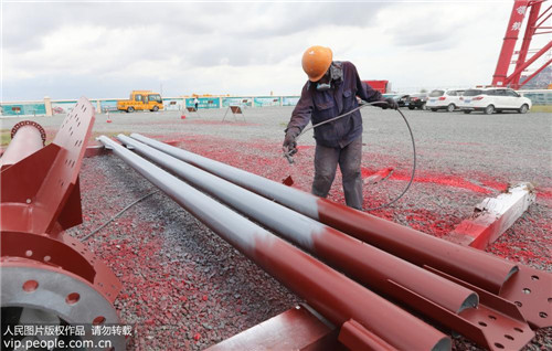 2018年9月10日,在500千伏舟山大陆联网工程的金塘岛施工现场,一名工作人员在地面上完成第1064根钢管塔的石墨烯改性重防腐电网专用涂料的喷刷工作,目前整体工程进入施工冲刺阶段。按照预定计划,10月下旬将建成世界最高输电铁塔。