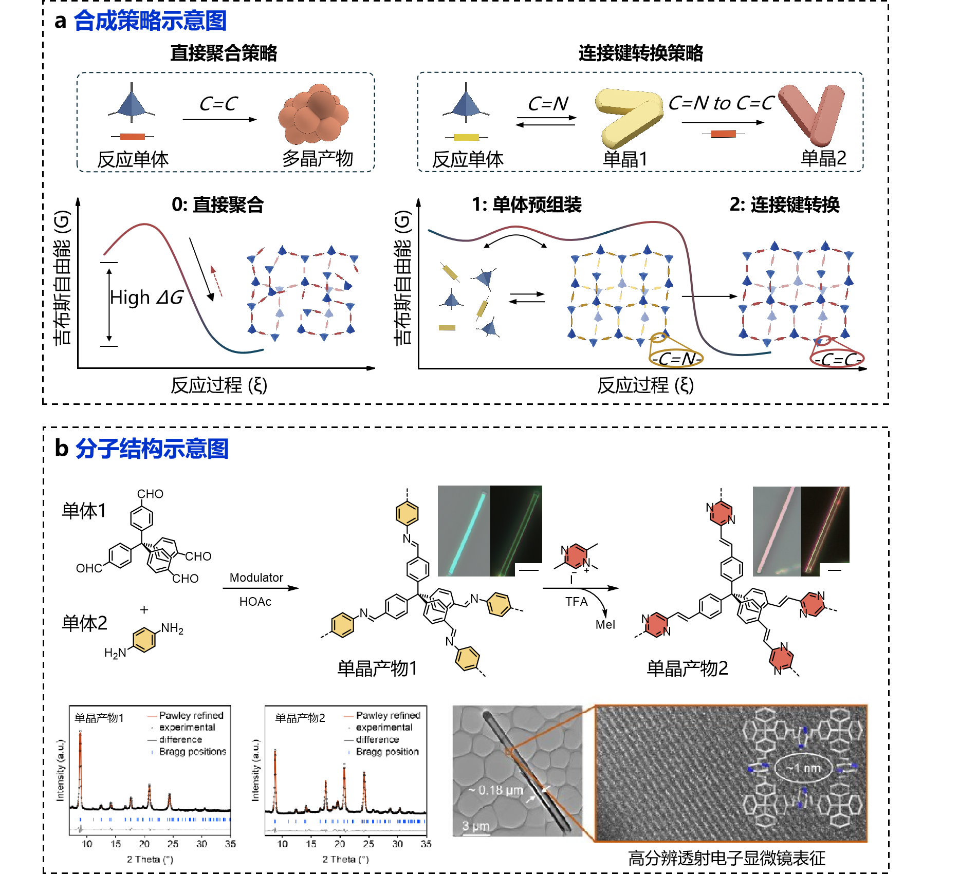 sp2-碳共轭有机框架聚合物(sp2c-COFs)得益于稳定的碳碳双键连接,具有卓越的化学稳定性及π共轭特性,能有效增强材料电子离域性能,因而是一类具有广阔应用前景的有机半导体新材料。具有明确结构的单晶sp2c-COF是研究其基本物理特性和器件性能的关键。然而,由于C=C成键化学的低可逆性,框架聚合物在直接聚合时通常面临动力学陷阱,导致无定形或多晶产物。目前没有有效方法制备单晶态sp2c-COFs。