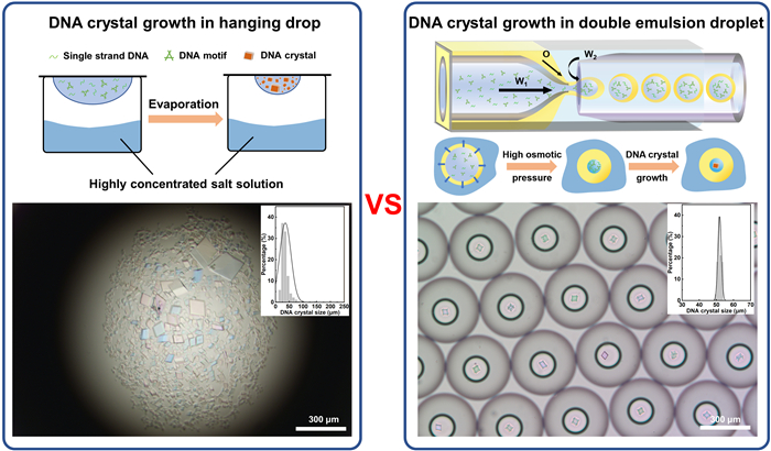 该研究利用微流控技术制备的双乳液微滴作为纳升级微反应器,在严格受控的微环境中进行DNA晶体的生长调控,实现了单个微滴中仅形成一个DNA单晶的高效结晶方式,其成功率高达98.6%。这种方法不仅保证了DNA晶体的尺寸可控性,还提高了单晶的均一性,为DNA纳米材料的工程化应用奠定了基础。