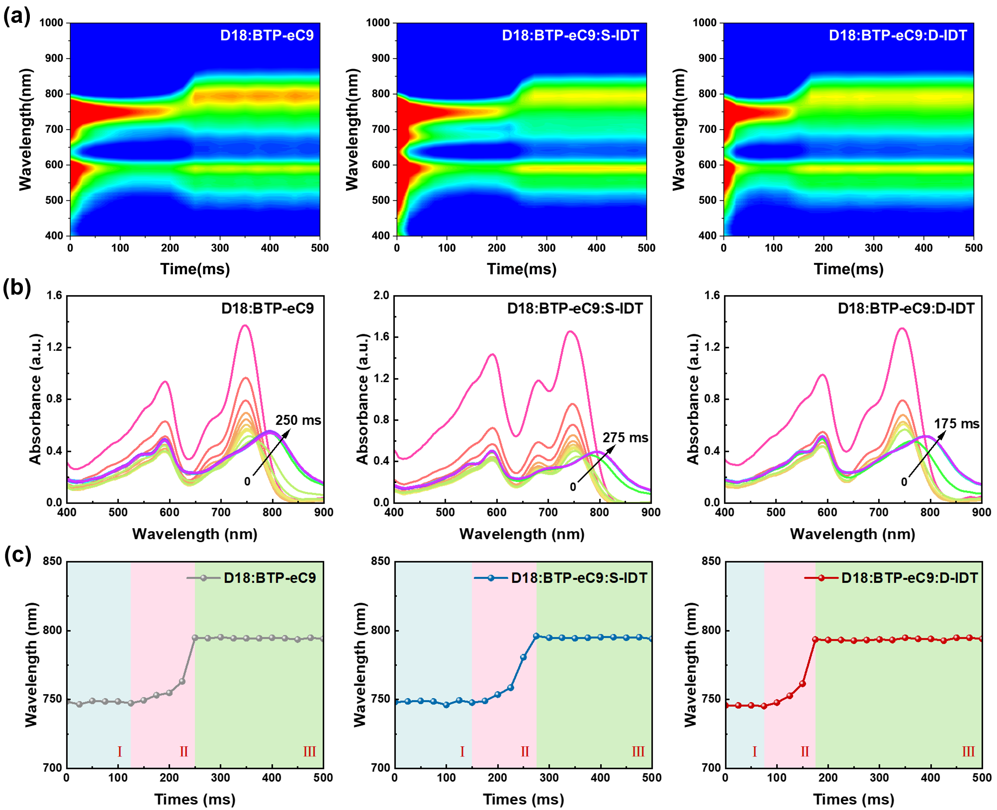 图2(a)三种共混体系在旋涂过程中的原位二维紫外-可见吸收轮廓图;(b)相应体系的原位紫外-可见吸收线剖面图;(c)从相应吸收轮廓图中提取的受体峰位置的时间演变图