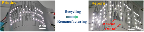 柔性电路是一种创建在柔性基板上的特殊电路。目前其应用还存在着两大挑战:一是疲劳特性差,多次循环应变下易断裂失效;二是不能循环利用,传统焚烧、酸洗等回收方式污染环境。针对上述挑战,博士生李法利、刘宜伟副研究员和李润伟研究员等在纸上制备了液态金属基柔性电路,替代传统的铜、铝、银等电路,不仅解决了其弯折疲劳性差的问题,而且可回收(图2为用回收前后的液态金属制备的电路),实现了纸基电路在制造、使用、回收等全生命周期的绿色化。电路线宽在10μm-200μm间可调,且通过多达10000次的对折测试发现,该电路电阻的最大变化率仅为4%,具有很好的应变稳定性。此外,该纸基电路具有良好的散热功能。实验显示,在液态金属基纸基电路工作的LED灯相对于纯纸表面的LED灯温度有显著降低。该工作为发展绿色可回收的柔性电路提供了新的方法,成果发表在了Advanced Materials Technologies(Adv. Mater. Technol. 2018, 1800131)上。