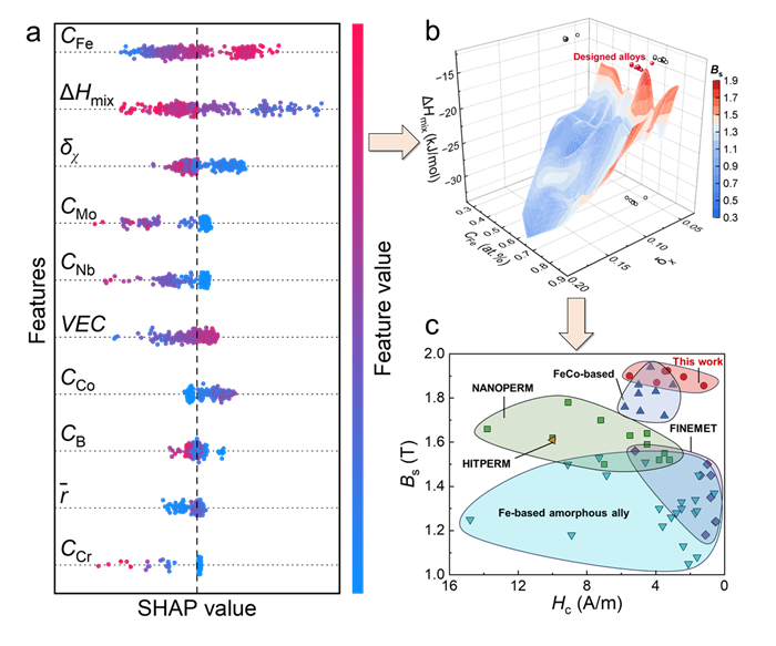 图2 通过机器学习的合金设计准则研发高Bs铁基非晶合金。(a) 合金各特征的SHAP值布; (b)Bs在 CFe-ΔHmix-δχ空间中的分布; (c) 不同类型的铁基非晶/纳米晶合金的Bs和Hc对比