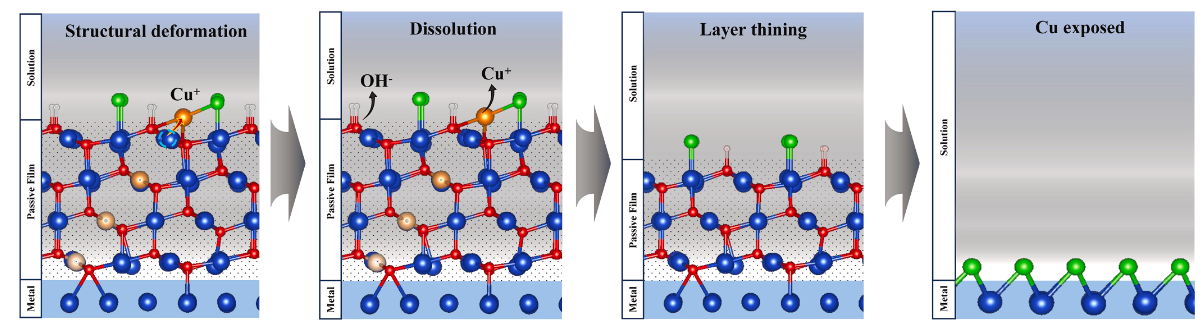 铜凭借其优异的导热导电性,在工业及海洋工程领域得到广泛应用。通常情况下,碱性环境可在铜表面形成以Cu2O为主的钝化保护膜,有效抑制腐蚀。然而,在富含氯离子的海洋环境中,该保护膜极易破坏脱落,导致材料失效。尽管先前研究提出了多种失效机制(如应力诱导断裂、局部溶解变薄、孔洞诱导坍塌等),但对于氯离子如何在原子尺度上促进Cu2O钝化膜破裂的精确过程与主导机制,科学界长期以来缺乏清晰认识。