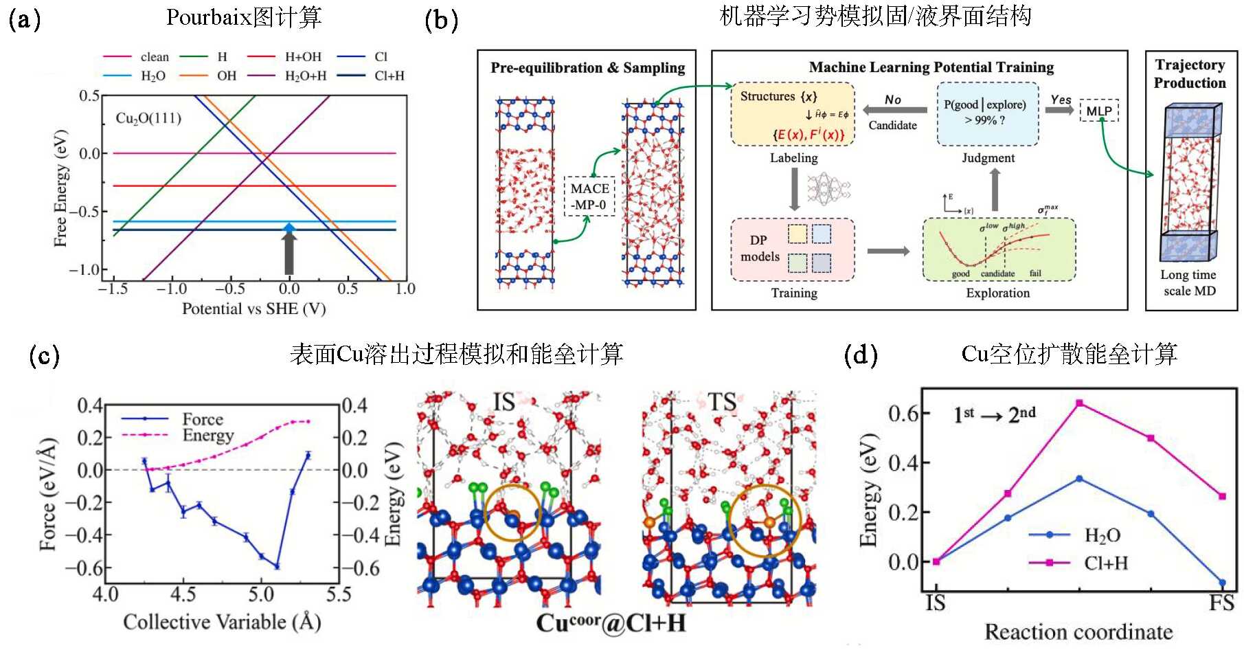 为准确理解这一机制,中国科学院宁波材料技术与工程研究所常可可团队与人工光合成与能源催化团队通力合作,综合运用第一性原理热力学计算、基于机器学习势的分子动力学模拟及约束分子动力学等先进计算方法,取得了突破性发现:(1)氯离子在Cu2O表面发生强化学吸附;(2)氯离子的表面吸附显著降低铜原子溶出能垒;(3)氯离子吸附导致表面空位形成速率远超内部扩散速率。基于这些原子尺度的深入洞察,研究团队从微观动力学层面明确揭示了氯离子诱发Cu2O保护膜破坏的主导机制为局部溶解变薄机制。该机制的核心在于,氯离子吸附一方面强力加速表层铜原子的溶解流失,另一方面显著抑制了表面空位向材料内部的扩散速率。这种空位形成与扩散的巨大速率差异导致高浓度的表面空位无法及时“愈合”,从而在局部区域引发钝化膜急剧减薄并最终破裂。