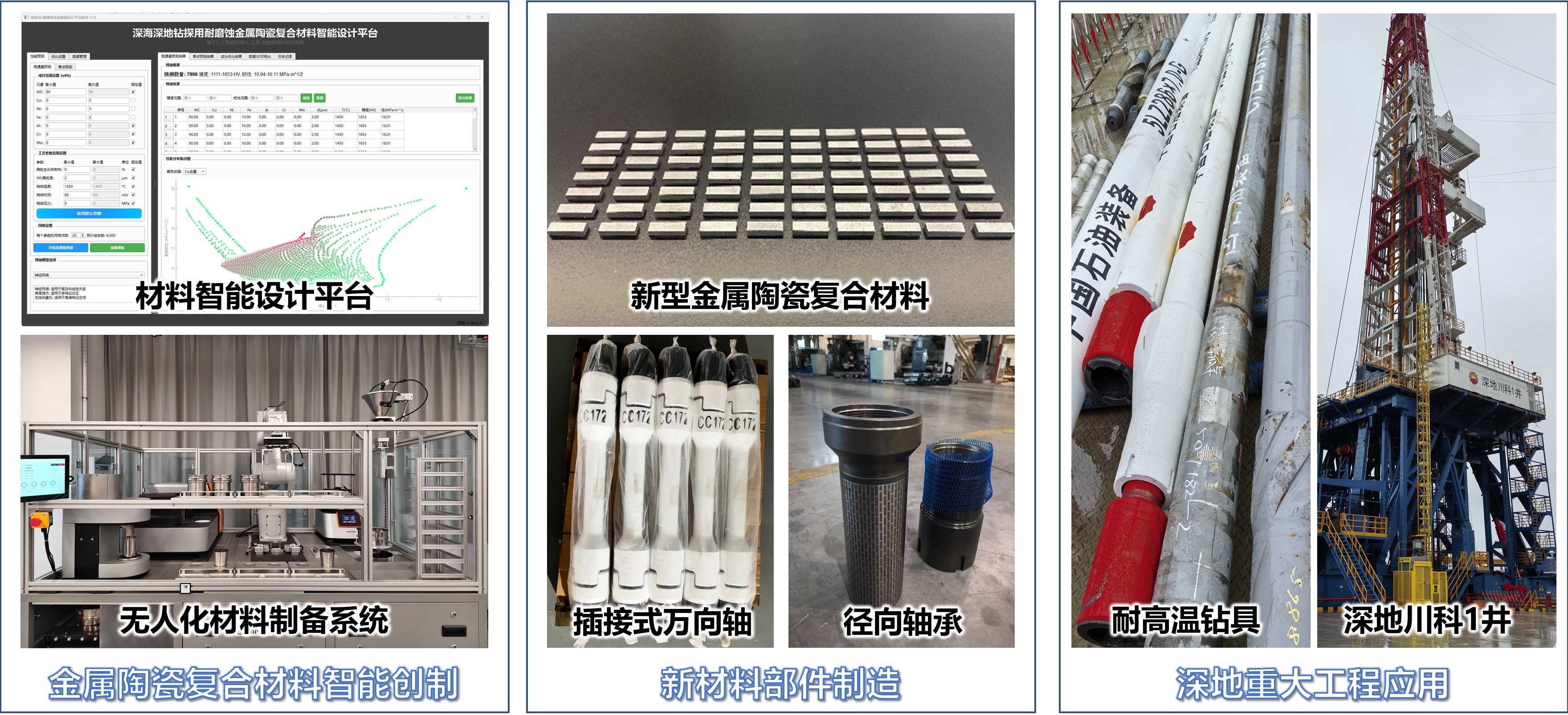 深地川科1井目标井深13000米,2023年7月正式开钻,7000米以下全部为未知地层,井下动力钻具关键运动部件及其复合材料在高温、高压极端环境下的服役可靠性面临严峻挑战。中国科学院宁波材料技术与工程研究所海洋关键材料全国重点实验室金属基复合材料AI创制团队在常可可研究员的带领下,开发了人工智能AI辅助的耐温/耐磨蚀金属陶瓷复合材料性能预测与成分设计模型(预测精度>90%),包含高通量预测、单点预测、成分优化、3D可视化等多个功能模块;基于该AI模型,筛选了满足目标性能的潜在成分区间,结合深钻材料智能创制平台开展的自动化制备和高通量表征实验,成功研制出新型耐温耐磨蚀多元金属陶瓷复合材料,力学、摩擦学等关键性能指标较现役三元材料体系提升15~30%,为耐高温螺杆钻具研发提供了关键材料支撑。