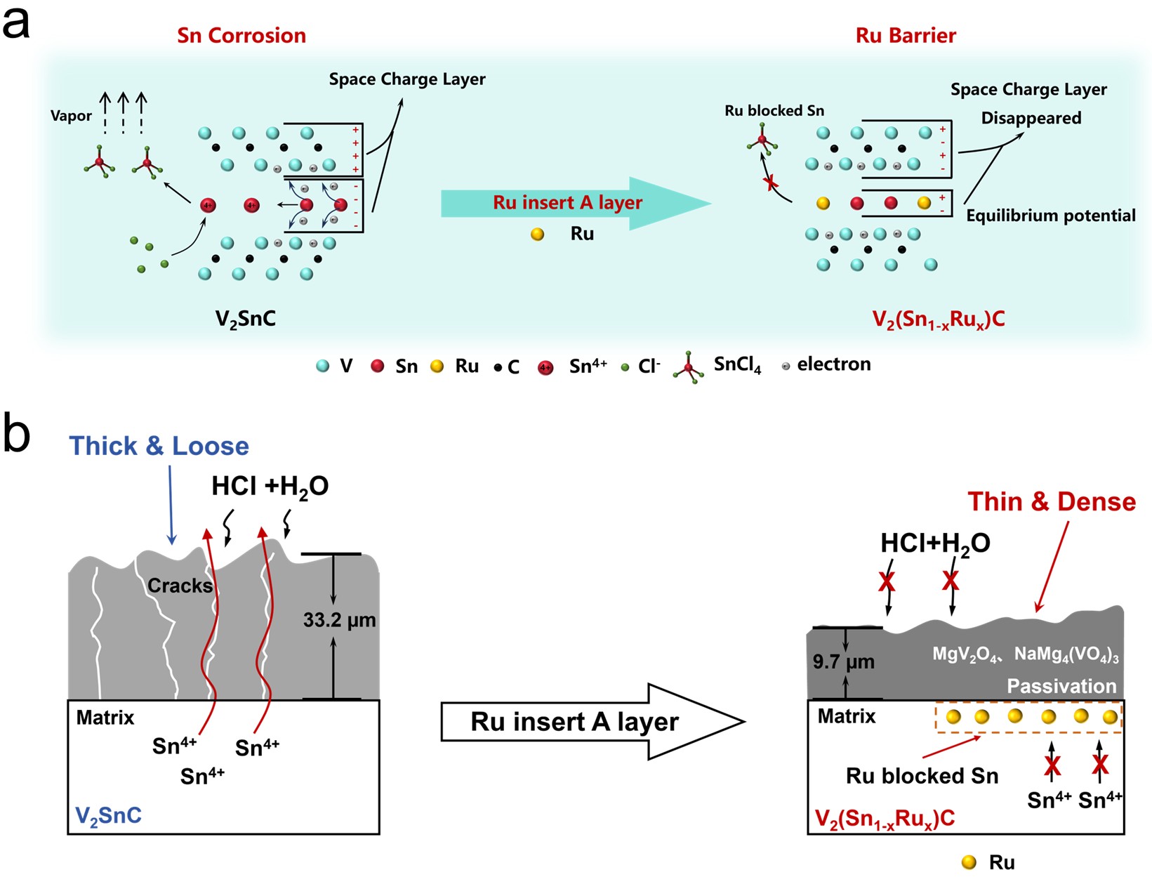 新型热能储能系统普遍采用高温氯化物熔盐作为储热介质,这些高腐蚀性熔盐在高温运行环境下会对系统中合金结构材料造成严重腐蚀,开发新型耐高温腐蚀结构材料成为推动该能源领域发展的关键。具有独特层状结构的三元碳化物MAX相材料(Mn+1AXn)兼具金属的优异导电导热性与陶瓷材料固有的高熔点、高热稳定性和良好机械强度,是下一代高温结构材料的理想候选者。该类材料的六方晶系结构由交替排列的M6X八面体层和A元素原子层构成,层间相对较弱的M-A键在极端环境下(高温氧化、腐蚀、电化学等)会发生显著的化学氧化,从而造成结构转变和物理性能的恶化。如何改善MAX相材料M-A亚层在极端条件上的结构稳定性是面向应用亟需攻克的难题。
