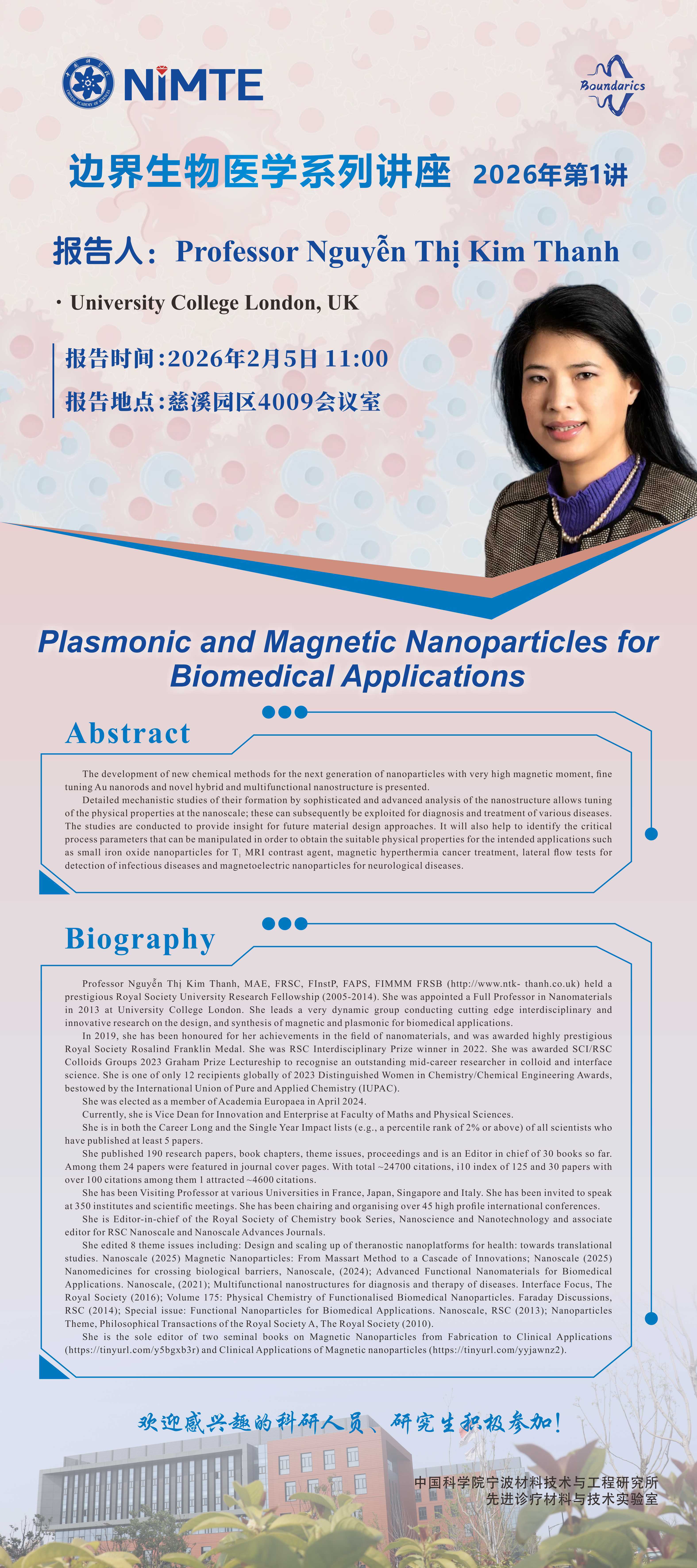 2月5日:Nguyễn Thị Kim Thanh:Plasmonic and Magnetic Nanoparticles for Biomedical Applications 发布:2026-01-30 点赞: 字号:小 大 打印: