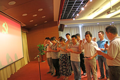 2012-2013年度发展的新党员在优秀共产党员代表范欣愉研究员的带领下,面对鲜红的党旗,举起右手庄严宣誓,表达了对党忠诚、爱国奉献的崇高追求。