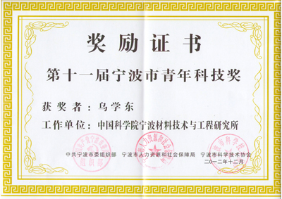 在2013年1月17日下午举行的宁波市科技界表彰大会上,中科院宁波材料技术与工程研究所乌学东研究员获第十一届宁波市青年科技奖。大会表彰了2名第五届全国优秀科技工作者和10位第十一届宁波市青年科技奖。