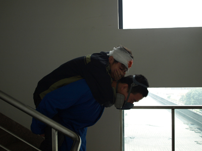 此时,三楼的一个办公室有人在窗口向外发出求救的信息,救援组迅速出动,戴上防毒面具、穿上防护服,奔向伤员所在地,对伤员进行简单包扎救助后,背起伤员迅速向楼下的安全地带撤离,同时,还将室内的部分贵重物资抢运出来。