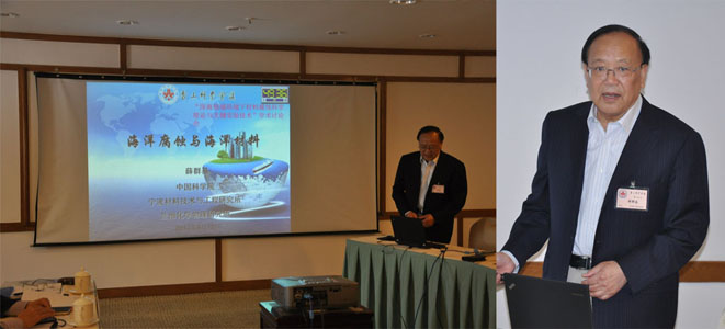 中科院宁波材料技术与工程研究所科技委员会主任薛群基院士、表面工程事业部陈建敏研究员、乌学东研究员、宋振纶研究员和曾志翔副研究员参会并做交流报告。薛群基作了“海洋腐蚀与海洋材料”的主题评述报告;陈建敏作了“深海开发的重大科学问题及其对特种装备和材料的需求”、乌学东做了“溶胶-凝胶自组装涂层在海洋材料防护中应用”大会交流报告。