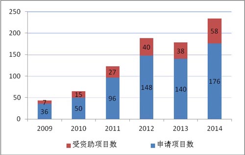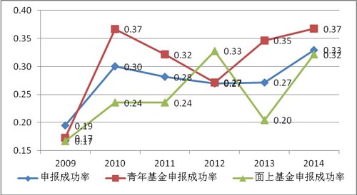 青年基金申报98项,成功立项36项(2013 年青年基金申报75 项,立项26项),资助金额996万元,申报成功率36.7%;面上基金申报56项,成功立项18项,资助金额1433万元,申报成功率32%,比2013年立项量增长1倍(2013 年面上基金申报44 项,立项9项);海外及港澳学者合作研究基金2项,资助金额40万元。